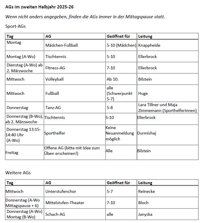 Übersicht über die angebotenen AGs (Stand: 06.03.2026):