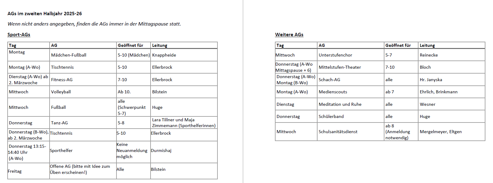Übersicht über die angebotenen AGs (Stand: 15.03.2026):