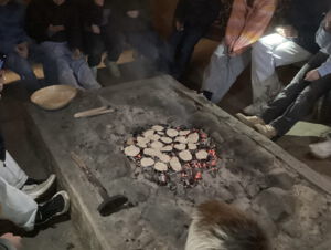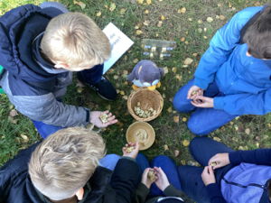Nach der Führung wurde es praktisch: Jede Klasse nahm an zwei Workshops teil. Beim Speerschleudern hieß es zielen und treffen wie unsere steinzeitlichen Vorfahren – gar nicht so einfach, aber ein riesiger Spaß! Beim Brotbacken durften wir selbst kleine Fladen über offenem Feuer rösten. Und wer Lust auf Geschicklichkeit hatte, konnte bei der „Kleinen Spielzeit“ alte Spiele ausprobieren, die schon Kinder in der Steinzeit oder bei den Römern gespielt haben.