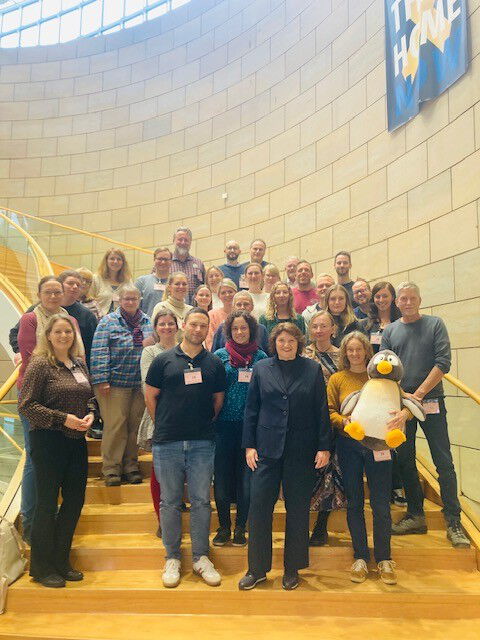 Zum Abschluss durfte auch das Pinguin-Maskottchen des Humboldt-Gymnasiums mit aufs Erinnerungsfoto – nachdem es den Besuch über geduldig in der Garderobe gewartet hatte.