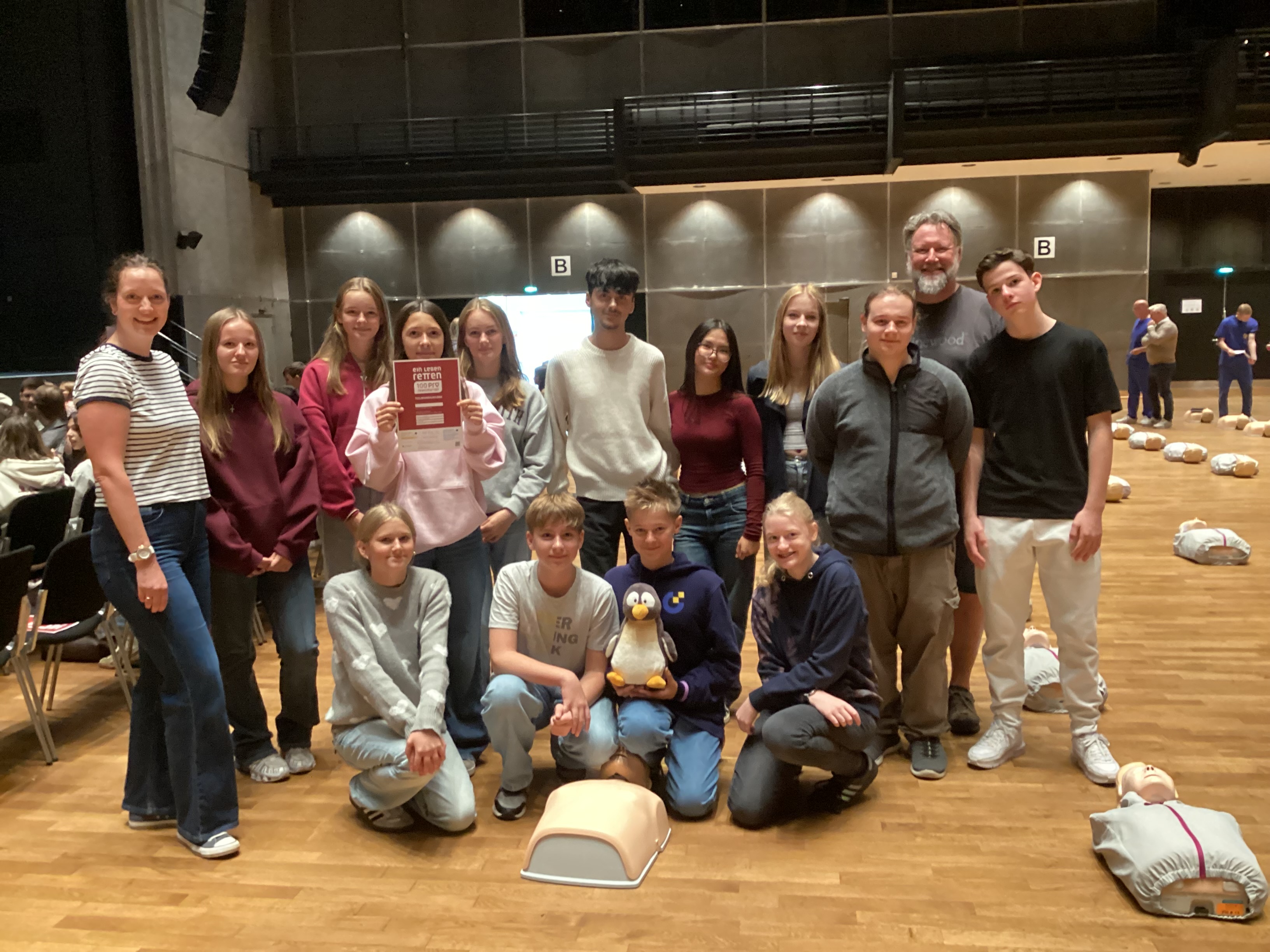 Im Rahmen der „Woche der Wiederbelebung“ nahmen 13 Schülerinnen und Schüler unseres Schulsanitätsdienstes am 22.09.2025 an einem Reanimationstraining in der Bielefelder Stadthalle teil. Schon die entspannte Anreise mit der Bahn sorgte für einen gelungenen Start in einen spannenden und lehrreichen Nachmittag.