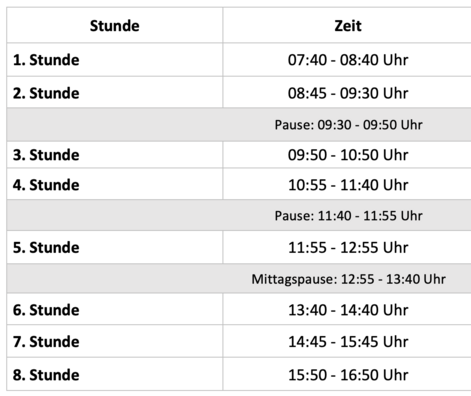 Am Vormittag wechseln Fachunterricht und Daltonstunden. Im Nachmittagsbereich findet nur Fachunterricht statt.